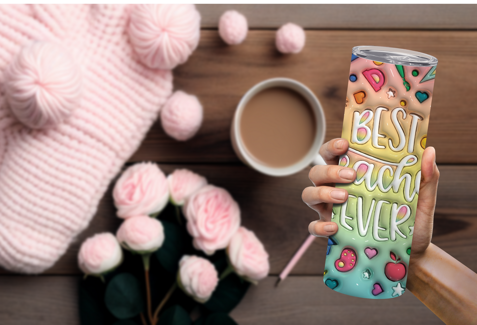 Sip and celebrate the 'Best Teacher Ever' with our 3D 20oz tumbler! Whether it's for your favorite educator or as a self-pat on the back, this tumbler adds a playful touch to your daily sips. Cheers to the best teacher ever- because the best teachers deserve the best cups!" 🍎📚🥤