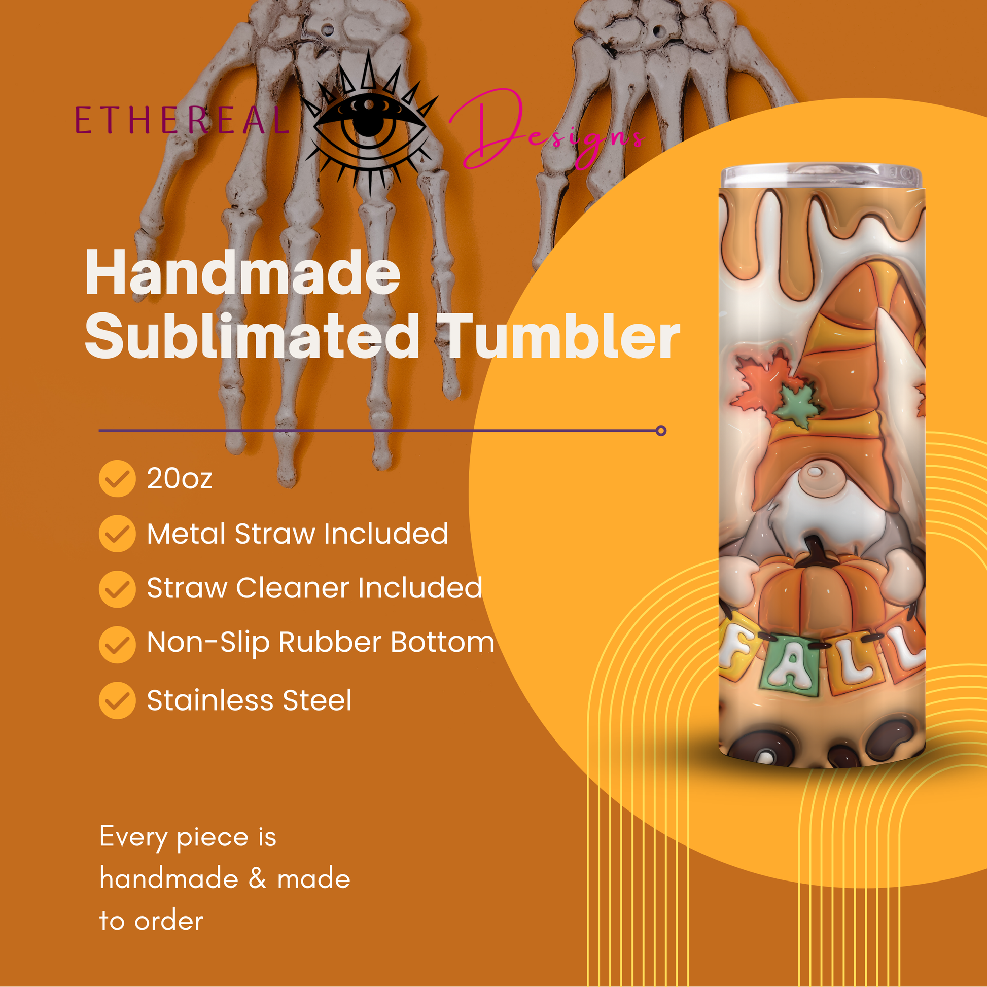 Our 3D 20oz tumbler, featuring adorable Fall Gnomes will get you in the spirit for Fall! Sip in the spirit of the season with these playful little companions. Whether you're enjoying pumpkin spice or a cozy brew, this tumbler adds a touch of whimsy to your fall festivities. Grab one and let the gnome-tastic sipping begin!" πππ₯€