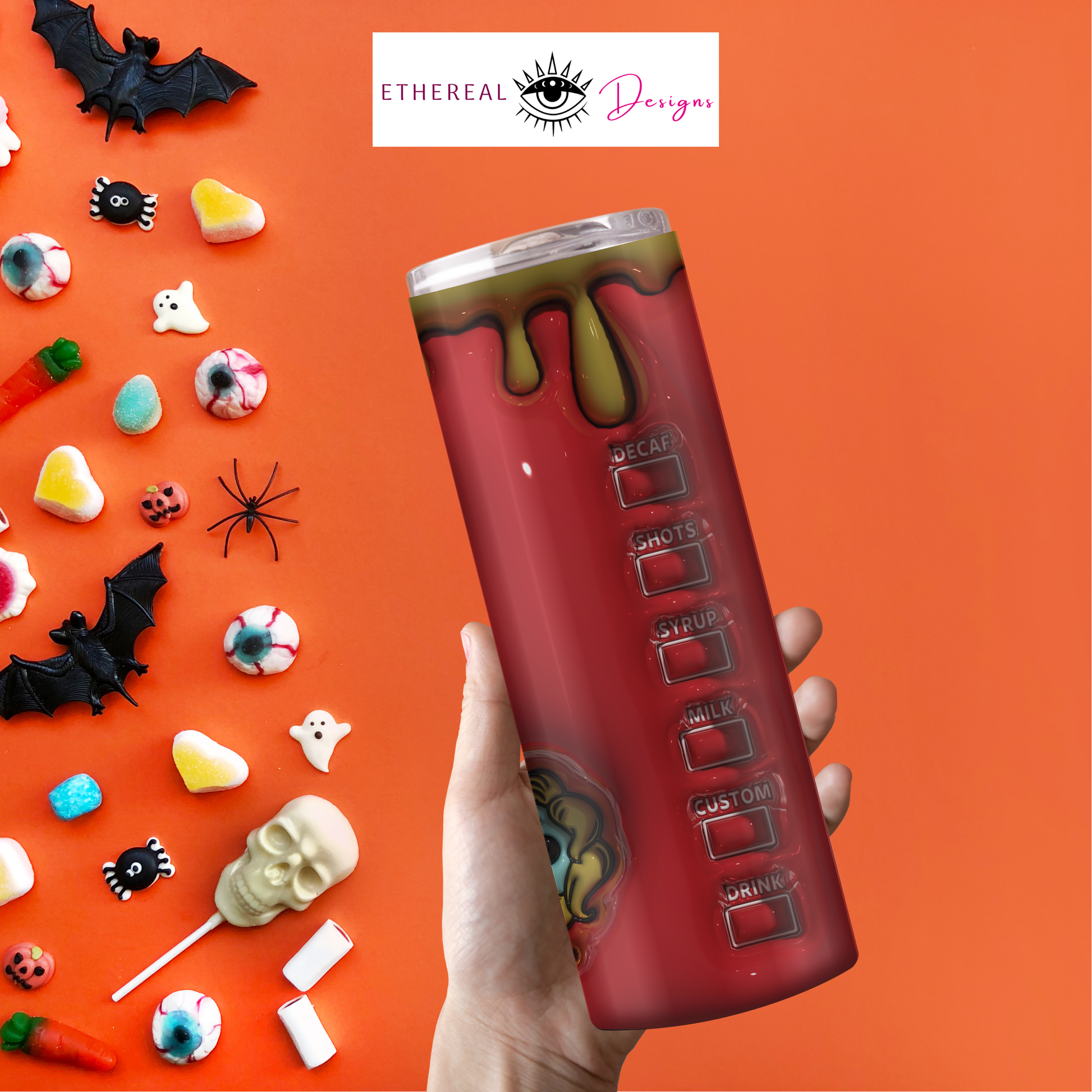 Prepare for a Halloween costume extravaganza on our 3D 20 oz tumblers, where a lovable, mischievous character dons a variety of spook-tacular disguises. It's not just a tumbler; it's a playful showcase of enchanting transformations. Sip in style and let your tumbler be your guide on a whimsical costume adventure. Get ready to enjoy a sip of delightful mystery! πππ₯€